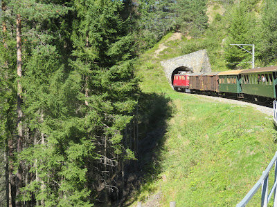 The two crocodile locomotives that have been used by the Rhaetian Railway (RhB) in the past are not available this year and the company is using a red GE 4/4 locomotive built in 1947. These are still in use in regular service although now mainly in freight. We rode in a beautifully restored first class car.